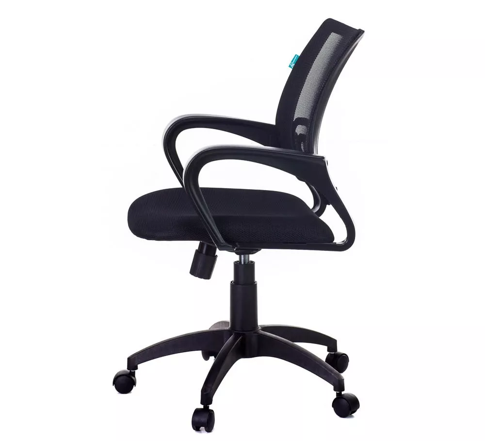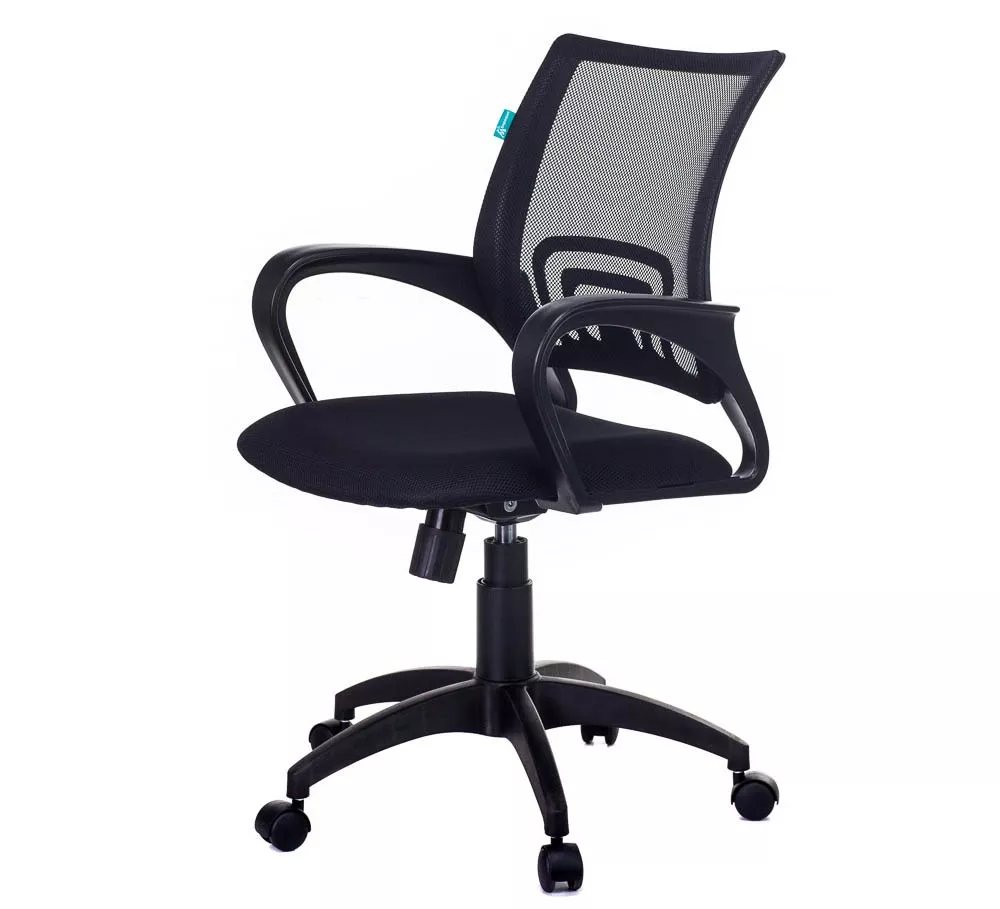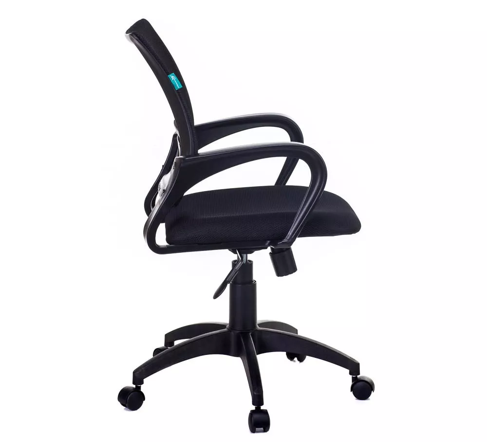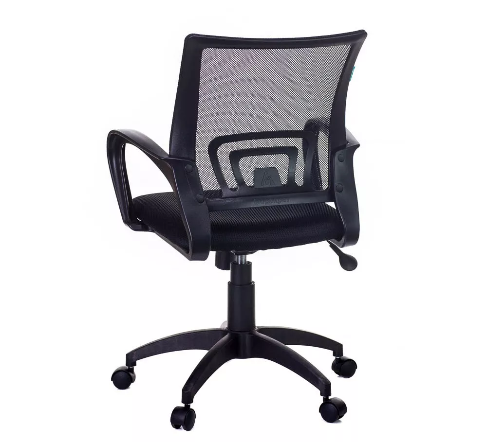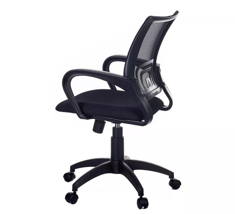 Ткань черного цвета, которой обтянуто сидение кресла, отличается своей прочностью и износостойкостью. Предусмотрен механизм качания. Пятилучевая крестовина изготовлена из прочного пластика. В сочетании с поворотными колесиками, она позволяет креслу легко и бесшумно передвигаться по любому напольному покрытию. Ограничения - вес более 120 кг.