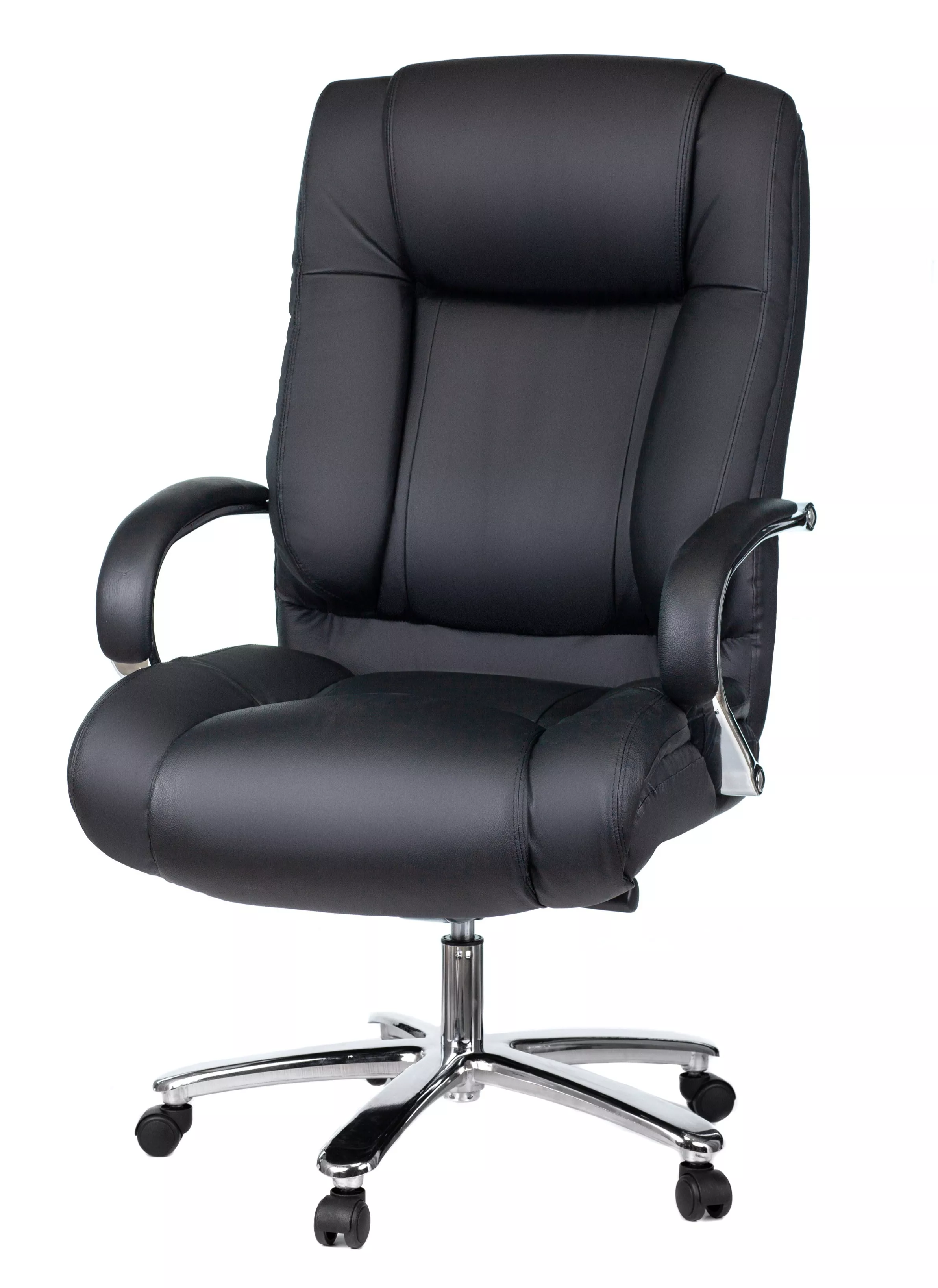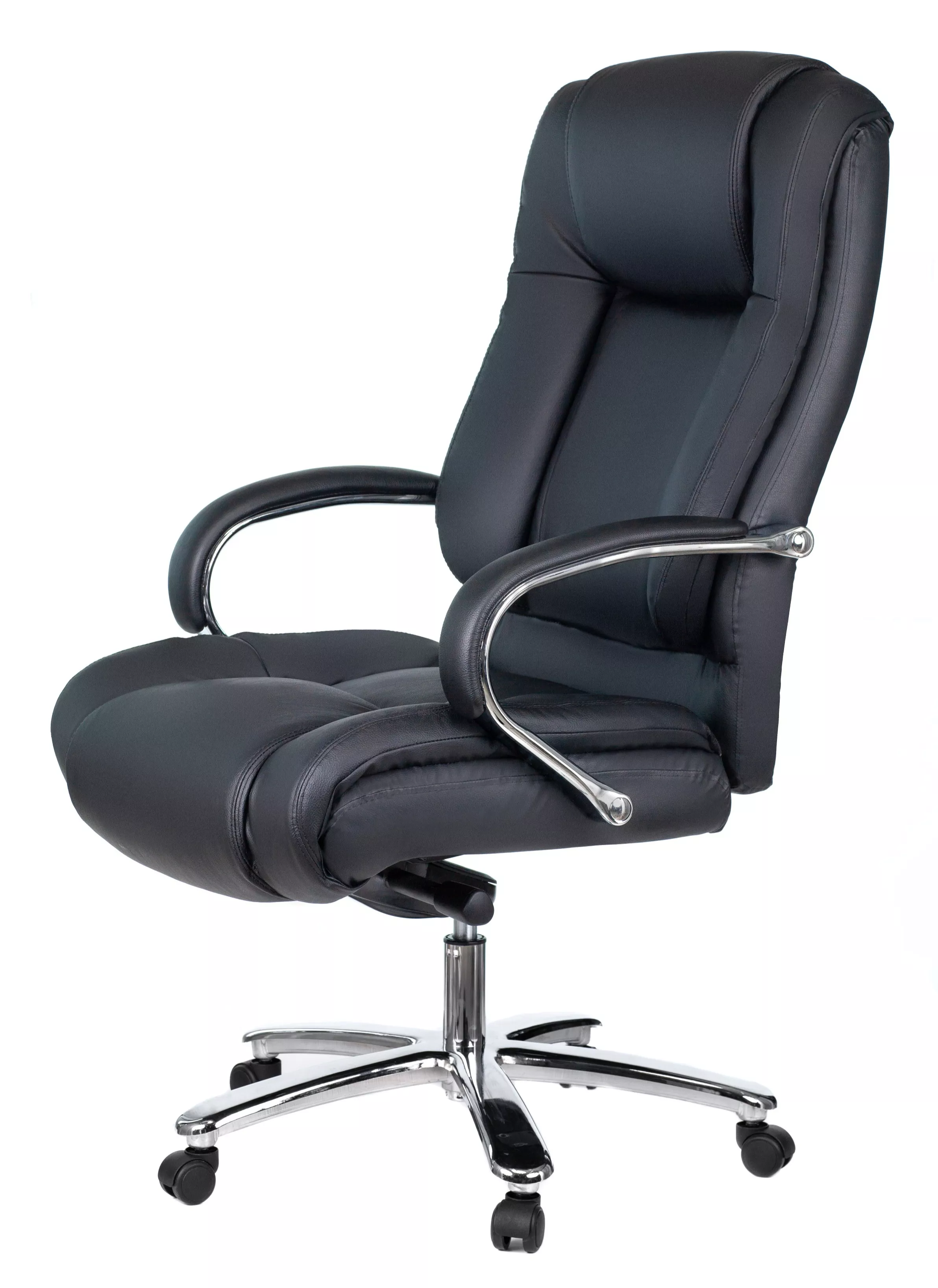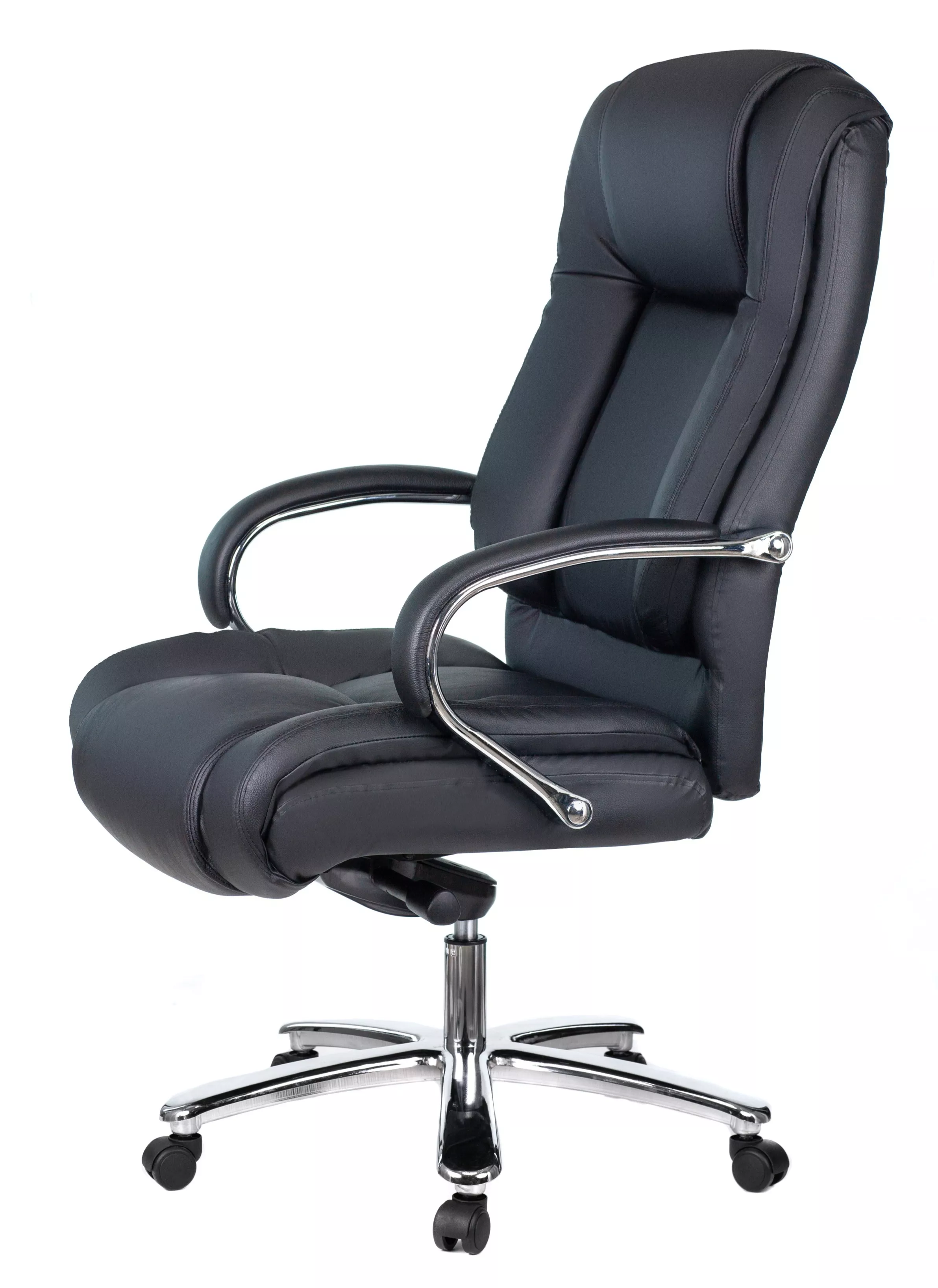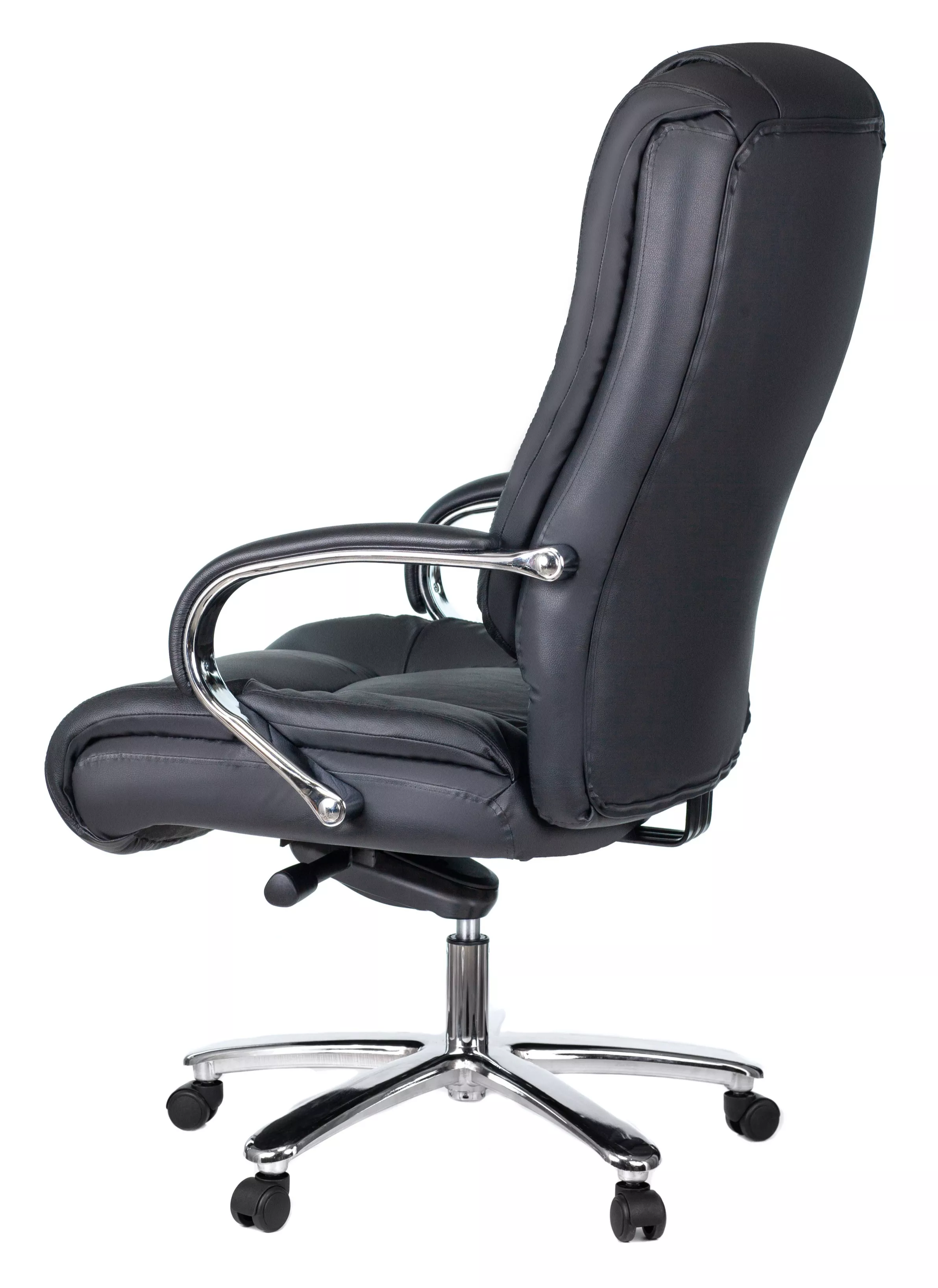 Кресло изготовлено из высококачественной экокожи черного цвета, которая отличается прочностью, гибкостью и долговечностью. Внешнее покрытие выглядит презентабельно и не поддается загрязнениям. Пластиковые колеса подходят для любого покрытия. Они не поцарапают ламинат, линолеум или паркет. Зафикси...