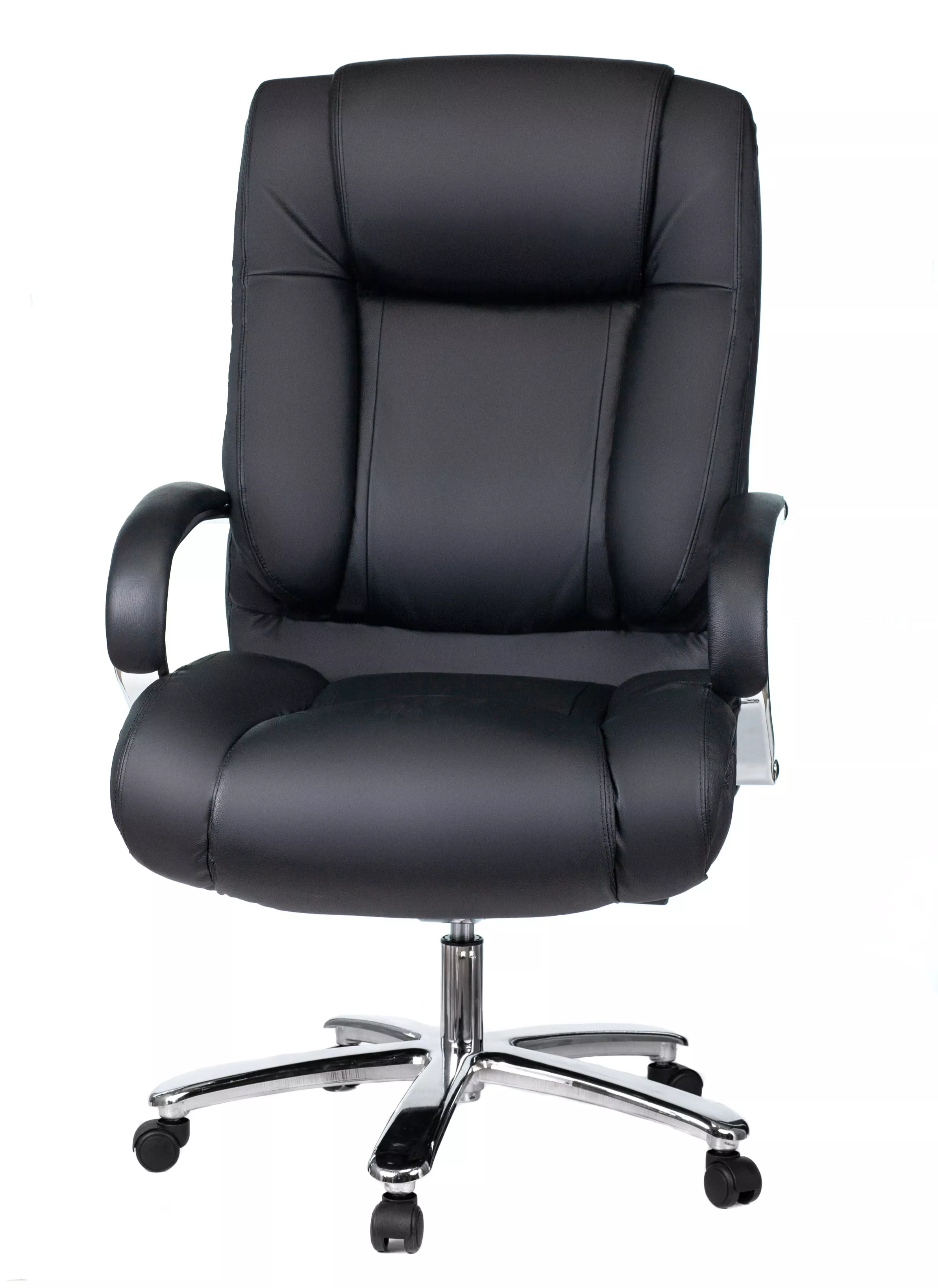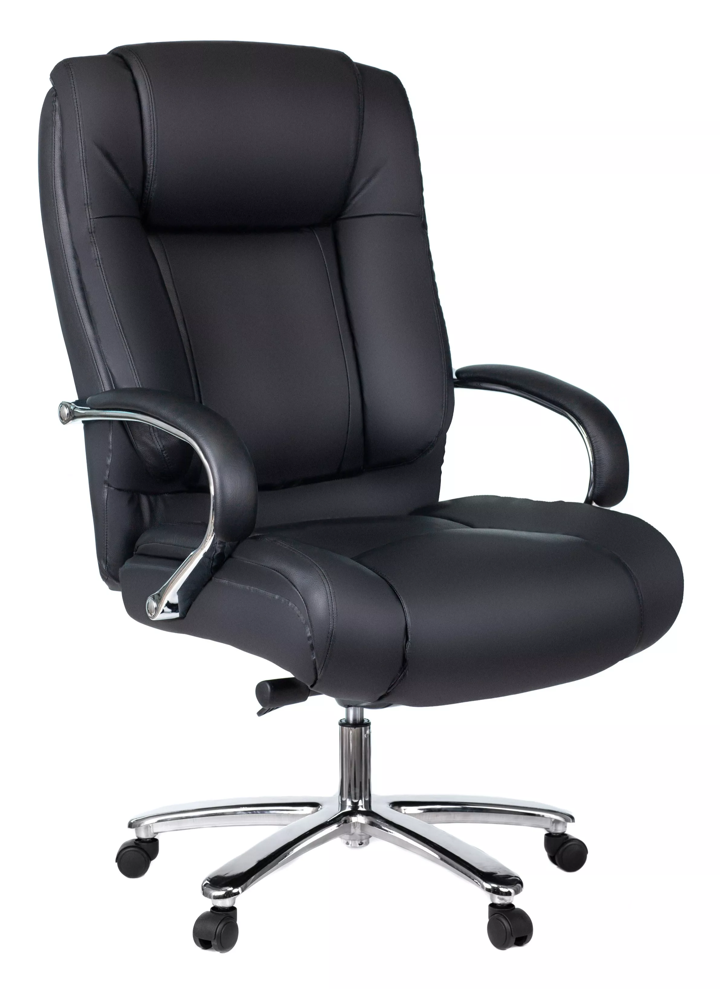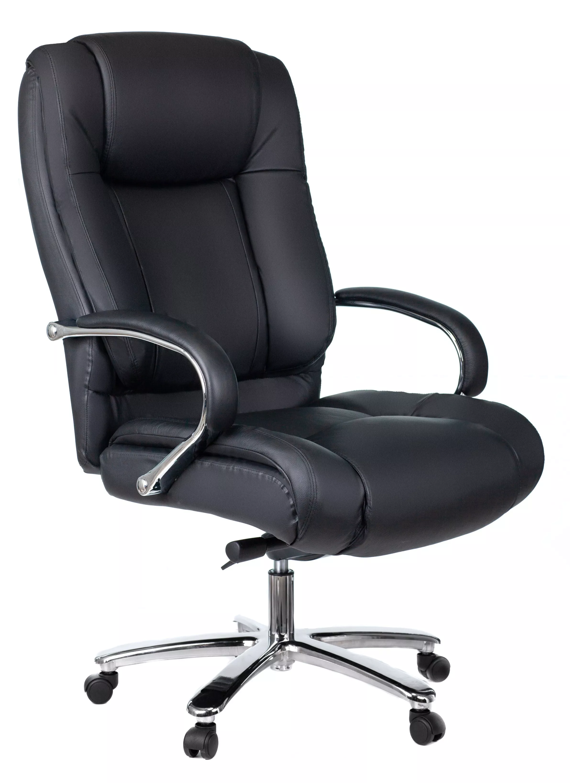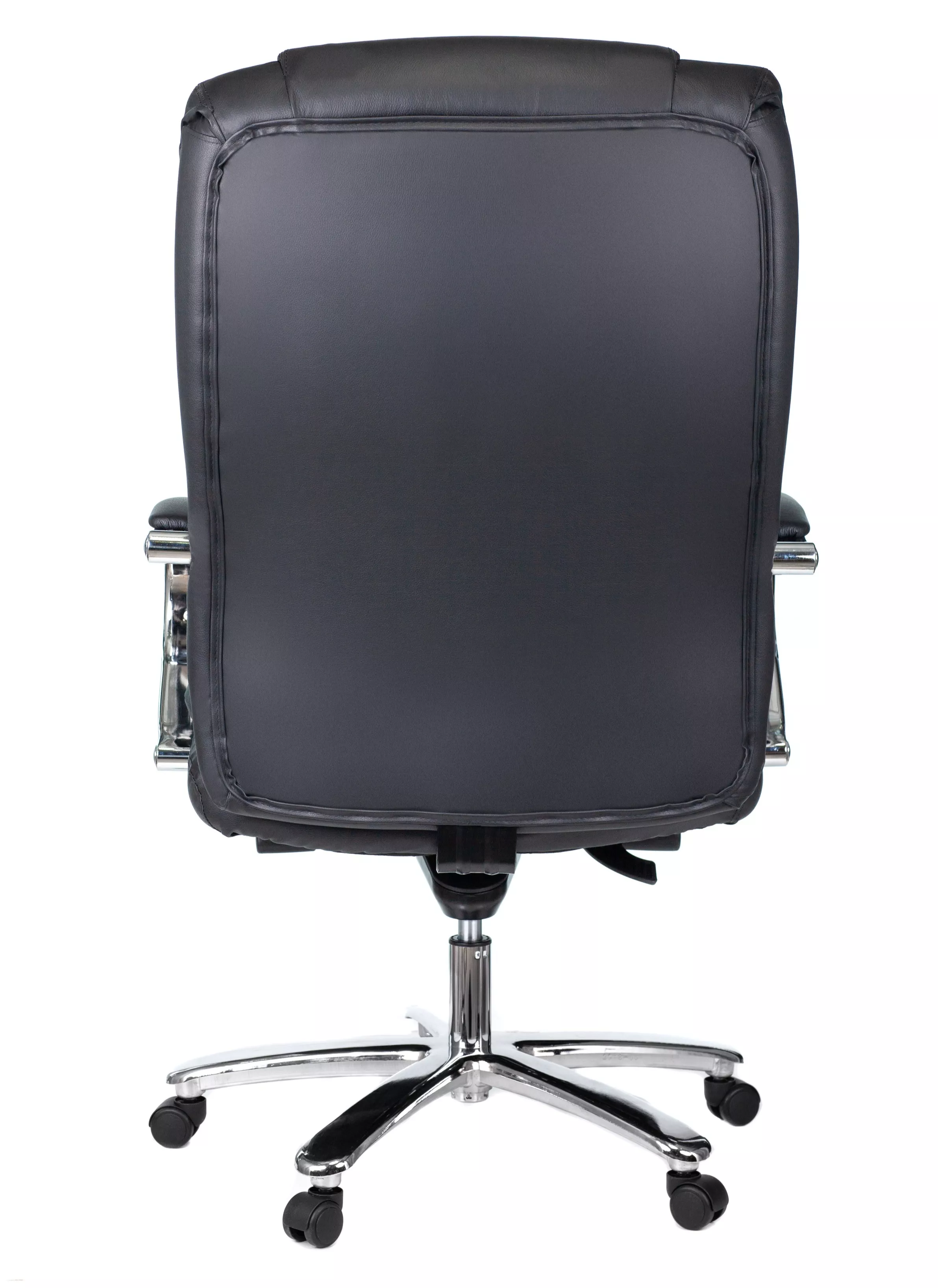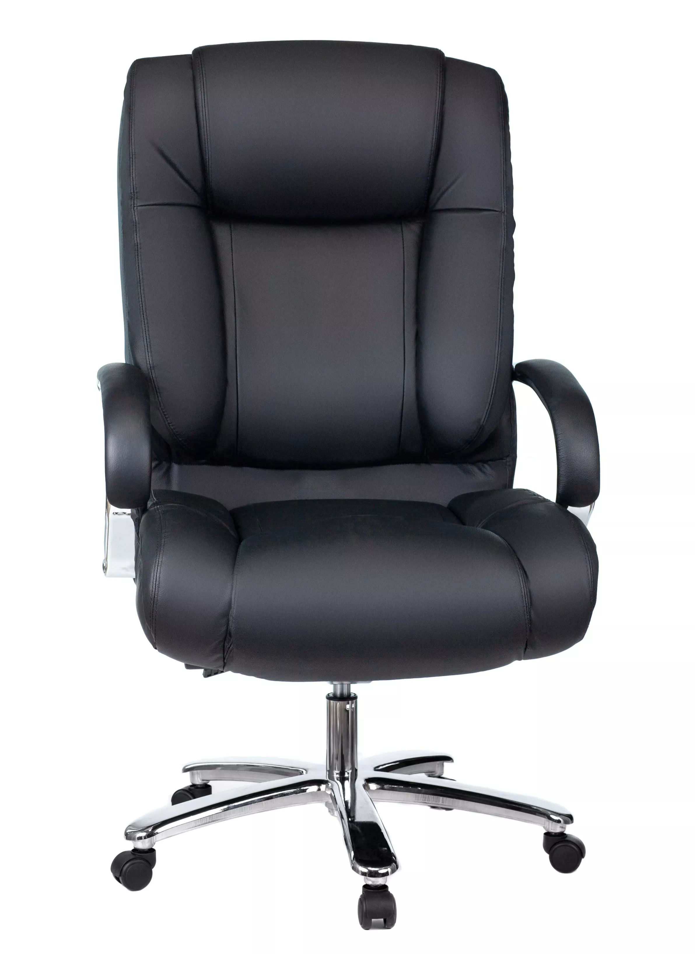 Кресло изготовлено из высококачественной экокожи черного цвета, которая отличается прочностью, гибкостью и долговечностью. Внешнее покрытие выглядит презентабельно и не поддается загрязнениям. Пластиковые колеса подходят для любого покрытия. Они не поцарапают ламинат, линолеум или паркет. Зафикси...