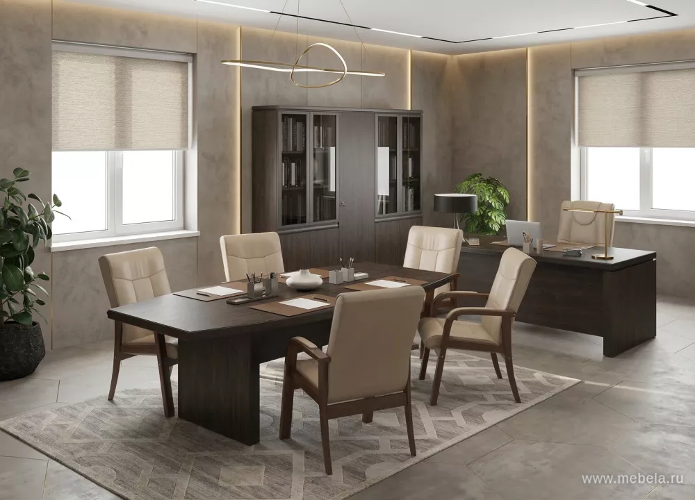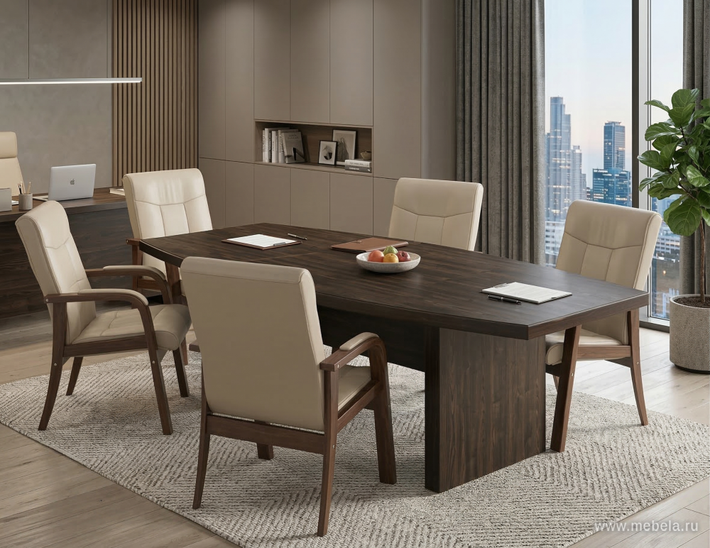 Классическая геометрия смягчена полуовалами на длинных сторонах столешницы. Все элементы стола имеют изысканный оттенок хорошо обработанной натуральной древесины, создают серьезную деловую атмосферу, способствуют позитивным договоренностям и взаимовыгодному долговременному сотрудничеству. Доступ...